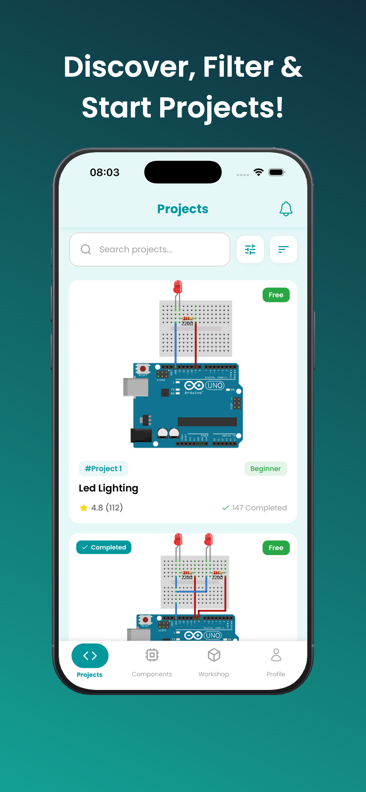 Browse projects from beginner to advanced. Each project includes step-by-step circuit diagrams, source code, video tutorials, and a full list of required components.