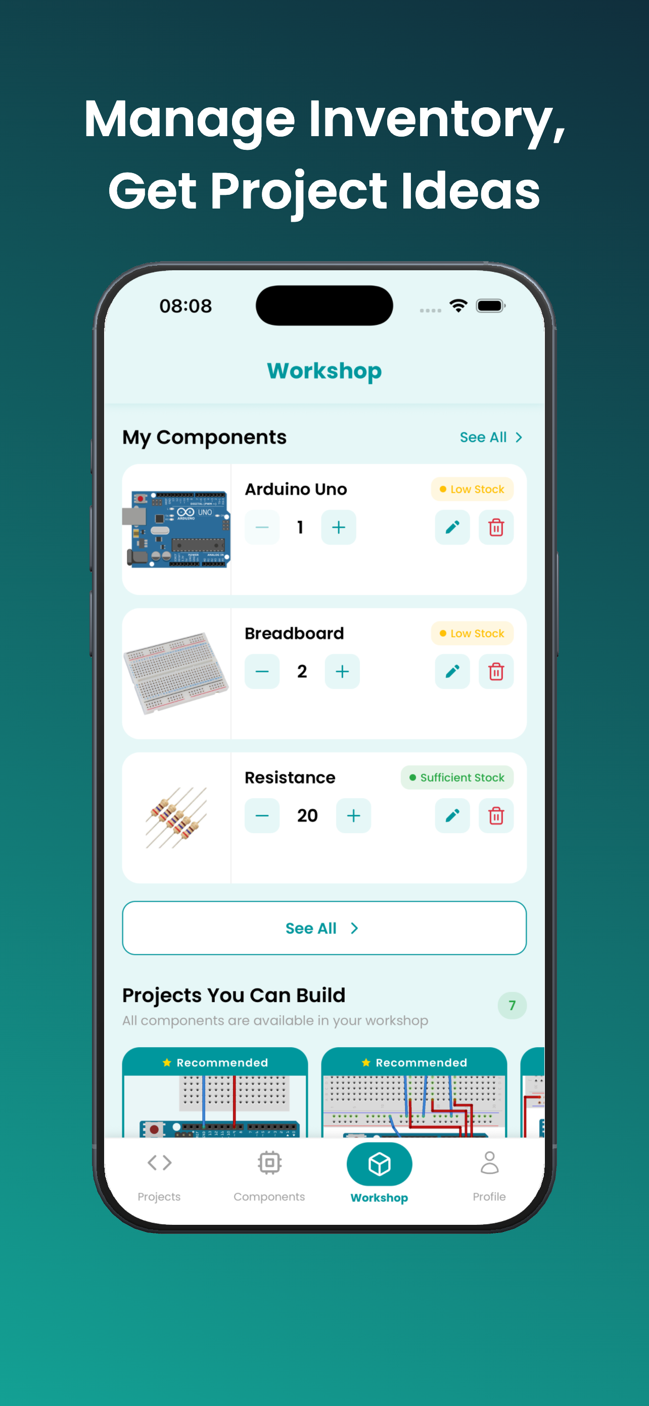 Manage your component inventory, get smart project recommendations based on parts you own, and earn badges as you level up your maker skills.